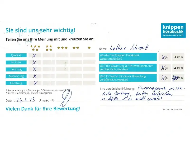 Und auch bei künftigen Fragen sind wir für Sie in Bamberg und Hirschaid direkt vor Ort und bieten Ihnen einen hochwertigen Hörgeräte-Rundum-Service.